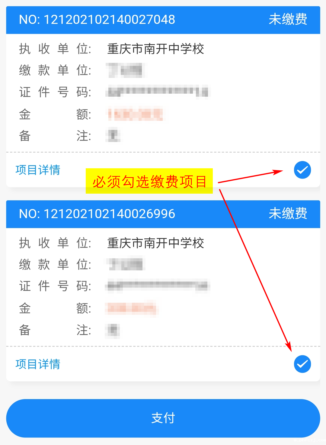 (1) 请认真核对订单显示的学校名称(执收单位)、学生姓名(缴款单位)、金额等信息,点击“项目详情”可以查看缴费项明细;